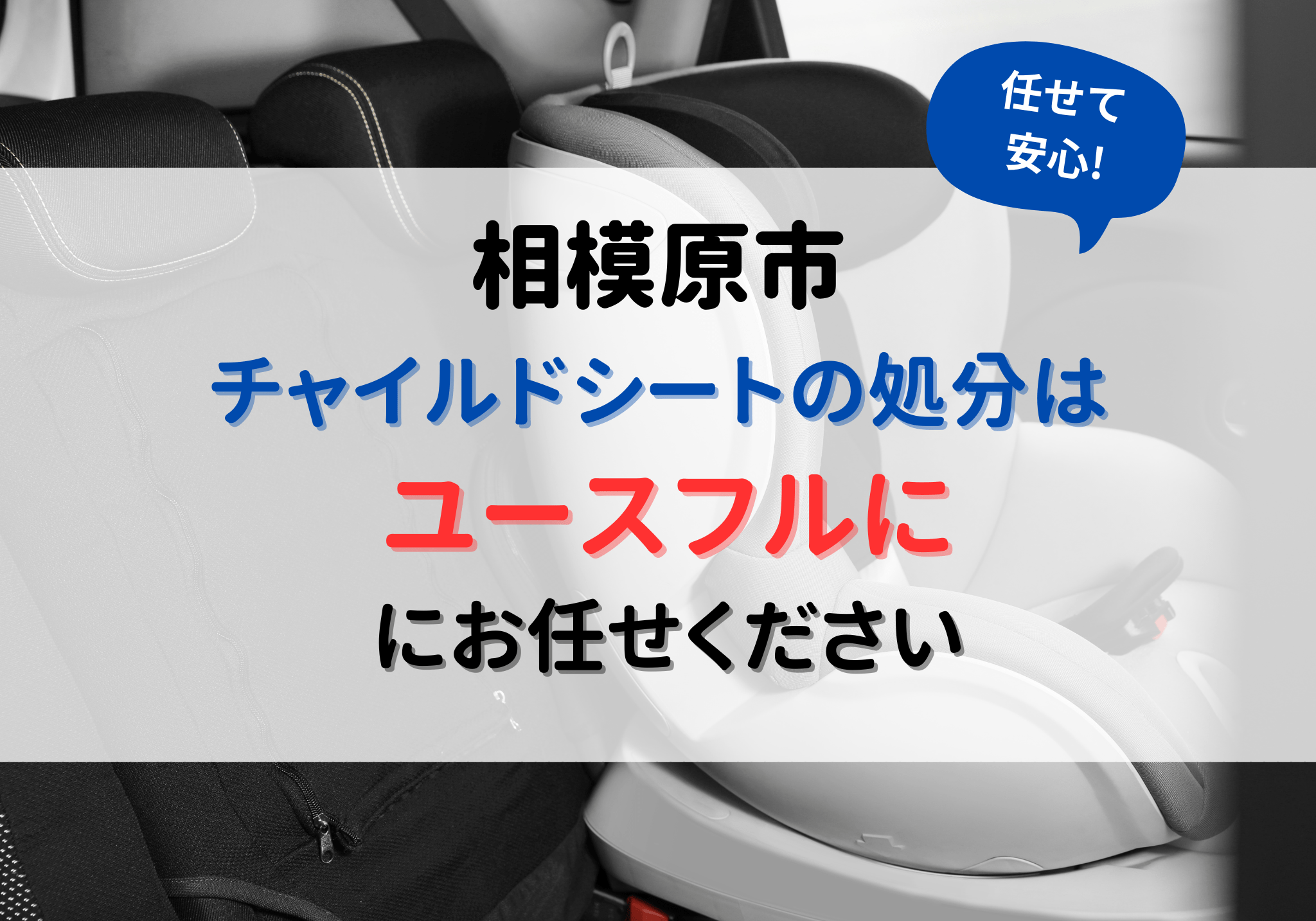 相模原市でチャイルドシートを処分する方法と費用相模原市でチャイルドシートの処分にお悩みの方は便利屋「ユースフル」におまかせください。チャイルドシートの処分は3,300円〜で対応いたします。お見積もりは無料ですのでお気軽にご相談ください。相模原市ではチャイルドシートは自治体サービスにて粗大ごみとして処分できます。料金はリーズナブルですが複数ある場合は搬出などが大変です。相模原市でチャイルドシートを処分する方法を以下に示しています。処分方法費用の目安手間一般ごみとして処分する※50cm未満のもの無料× 大変戸別収集を利用して粗大ごみとして処分する※粗大ごみ扱いの場合400円専用の処理施設へ持ち込み粗大ごみとして処分する※粗大ごみ扱いの場合10kgあたり240円買取業者を利用する0円(プラスになる場合あり)△ 手間がかかるフリマアプリ・ネットオークションを利用する× 大変便利屋「ユースフル」3,300円〜◎ 簡単チャイルドシートのサイズや重量などによって料金は変動します。お困りごとのある方はお気軽にご相談ください。チャイルドシートを処分するのが面倒で業者に丸投げしたい方は、便利屋「ユースフル」にお任せください。チャイルドシートの処分は3,300円〜で対応できます。お見積もりは無料ですので、お気軽にご相談ください。相模原市での自治体サービスにて処分する相模原市では50cm未満のものは一般ごみとして処分できます。一般ごみ扱い扱いであれば処分費用はかかりません。収集曜日の朝8時30分までに決められた集積場所に出します。透明又は半透明の袋に入れて処分することになっています。なお、一度に大量に出す場合、あまりにも多すぎると対応してもらえないこともあります。あらかじめ自治体に相談しておきましょう。また、指定の集積所までは自分で運ばなくてはならず、大量にある場合は搬出・運搬などに手間がかかります。サイズが大きいチャイルドシートを処分する場合規定サイズに解体して一般ごみとして処分することも可能です。ただし、サイズの大きいチャイルドシートを解体するには、プラスチックの切断など手間のかかる作業が発生します。慣れていないと怪我をするリスクもあるので避けるのが無難です。サイズの大きいチャイルドシートは、そのままの状態では粗大ごみ扱いとなります。粗大ごみとして処分する50cm以上のチャイルドシートは粗大ごみ扱いとなっています。処分料金は、戸別収集を依頼する場合と持ち込み処分をする場合とで異なります。粗大ごみは電話、インターネット、はがきにより事前に申し込む必要があります。粗大ごみ収集シールをお申し込み後に購入します。粗大ごみは収集日当日の午前8時30分までに、指定場所にだすこととなっています。混雑時期には収集日が1カ月以上先になる場合があるので、早めに申し込むことをおすすめします。戸別収集を利用する戸別収集を利用して粗大ごみとして処分する場合、処分費用は申し込み時に確認が必要です。戸別収集であれば、持ち込む手間がかかりません。以下が申し込み先になります。戸別収集の申込先電話での申し込み電話番号:042-774-9933受付時間:月曜日〜金曜日(祝日、12月29日〜1月3日は休業) 午前8時〜午後6時インターネットでの申し込み24時間受付相模原市粗大ごみ受付事務所 インターネット受付はがきでの申し込み相模原市緑区下九沢2074-2 北清掃工場内 粗大ごみ受付事務所申し込み時の確認事項・収集日・受付番号・品目・個数・必要な収集シール枚数・持ち出し場所・手数料シールへの記入・氏名・受付番号・収集月日粗大ごみ収集シールは400円の1種類のみなので、手数料分の枚数のシールを購入する必要があります。収集シールの払い戻し、再発行はできないので申し込み時に確認して購入しましょう。粗大ごみ収集シールは、コンビニエンスストアなどの「粗大ごみ収集シール取扱店」の表示のある店舗にて購入します。粗大ごみ収集シールに必要事項を記入したら、見やすい場所に貼り付けます。収集日の朝8時30分までに持ち出し場所へ出せば立ち会いは不要です。指定場所まで搬出する必要があるので、量が大きい場合は大変です。状況に応じて処分方法を検討する必要があります。処理施設に持ち込み処分する粗大ごみ処理施設に持ち込み処分する場合、料金は10kgあたり240円です。あらかじめ重さを確認しておくと、おおよその費用を把握できます。相模原市の対象の処理施設は以下の通りです。 相模原市南部粗大ごみ受入施設住所:相模原市南区麻溝台1524-1電話番号:042-767-5305受付時間:月〜土曜日:9時〜16時(12/31〜1/3は休業) 相模原市北部粗大ごみ受入施設住所:相模原市緑区下九沢2083-1電話番号:042-775-5333受付時間:月〜土曜日:9時〜16時(12/31〜1/3は休業)津久井クリーンセンター住所:相模原市緑区青山3385-2電話番号:042-784-2711受付時間:月〜土曜日:月〜土曜日:9時〜16時(12/31〜1/3は休業)手数料は受付窓口で支払います。総重量を量り計算
