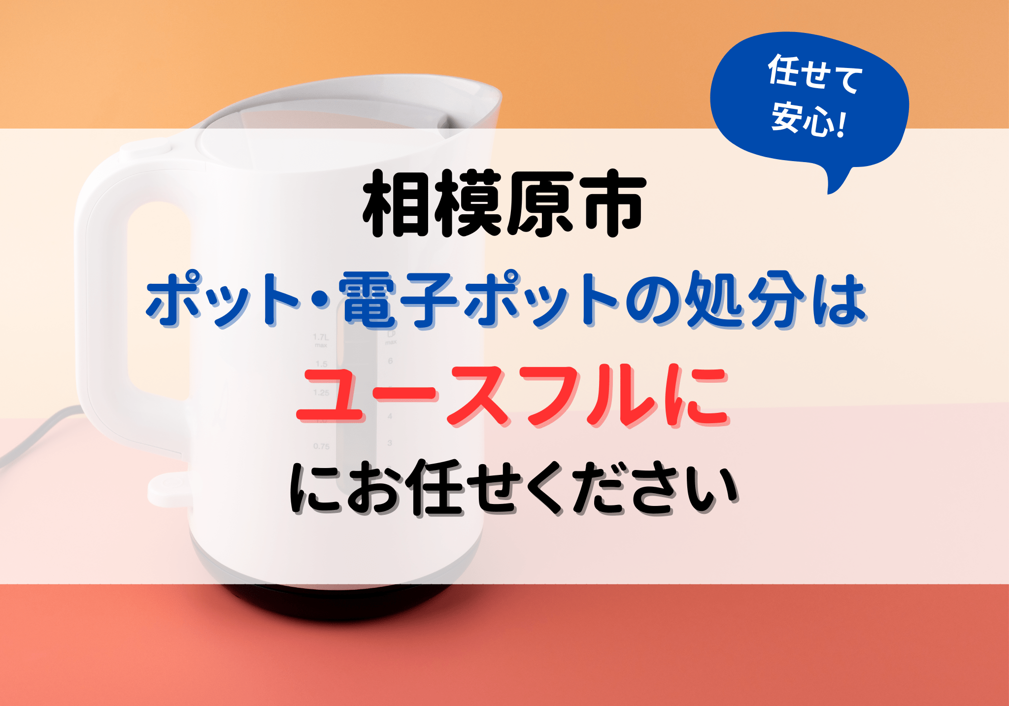 相模原市でポット・電子ポットを処分する方法と費用相模原市で電子ポットの処分にお困りの方は便利屋「ユースフル」におまかせください。電子ポットは1,100円〜処分対応しています。お見積もりは無料ですのでお気軽にご相談ください。相模原市では電子ポットは使用済小型家電として回収ボックスにて処分できますが、回収ボックスに入らないものは大きさに関わらず粗大ごみ扱いとなります。少量であれば手軽に処分できますが、大量にある場合は運搬に手間がかかります。相模原市でポット・電子ポットを処分する方法を以下に示しています。処分方法費用の目安手間使用済小型家電として処分する無料× 大変戸別収集を利用して粗大ごみとして処分する※粗大ごみ扱いのもの400円専用の処理施設へ持ち込み粗大ごみとして処分する※粗大ごみ扱いのもの10kgあたり240円家電量販店に下取りを依頼する0円〜(プラスになる場合あり)○ 簡単買取業者を利用する△ 手間がかかる個人売買もしくは必要な人に譲る× 大変便利屋「ユースフル」1,100円〜◎ 簡単処分するポットのサイズや数量などによって料金は異なります。お困りごとのある方は、お気軽にご相談ください。ポット・電子ポットを処分するのが面倒で業者に丸投げしたい方は、便利屋「ユースフル」にお任せください。ポット・電子ポットの処分は1,100円〜で対応できます。お見積もりは無料ですので、お気軽にご相談ください。相模原市で自治体サービスにて処分するポット・電子ポットは相模原市の自治体サービスにて処分でき、サイズによって処分方法が異なります。回収ボックスに入るものは使用済小型家電として処分一度投入した小型家電は取り出せないので注意が必要です。電池は抜き取って処分する必要があります。回収ボックスは市内24カ所に設置してあり、以下のようになっています。各施設の営業時間のみ利用可能です。回収ボックス緑区緑区合同庁舎・橋本台リサイクルスクエア・北清掃工場・北部粗大ごみ受入施設・津久井クリーンセンター・城山総合事務所・津久井総合事務所・相模湖総合事務所・藤野総合事務所・ノジマNEW城山店・イオン橋本店2階中央区相模原市役所本庁舎・ノジマ相模原本店・上溝まちづくりセンター・田名まちづくりセンター南区南区合同庁舎・麻溝台リサイクルスクエア・南清掃工場・南部粗大ごみ受入施設・相模台まちづくりセンター・相武台まちづくりセンター・東林まちづくりセンター・麻溝まちづくりセンター・イオン相模原店3階多量の小型家電を排出する場合麻溝台リサイクルスクエア橋本台リサイクルスクエア津久井クリーンセンター大量の小型家電を処分する場合は、別途施設が定められています。30センチメートル×15センチメートルの投入口に入るもののみ利用できます。粗大ごみとして処分するサイズの大きい電子ポットは粗大ごみ扱いとなっています。処分料金は、戸別収集を依頼する場合と持ち込み処分をする場合とで異なります。粗大ごみは電話、インターネット、はがきにより事前に申し込む必要があります。粗大ごみ収集シールをお申し込み後に購入します。粗大ごみは収集日当日の午前8時30分までに、指定場所にだすこととなっています。混雑時期には収集日が1カ月以上先になる場合があるので、早めに申し込むことをおすすめします。粗大ごみの戸別収集を利用する戸別収集を利用して粗大ごみとして処分する場合、処分費用は申し込み時に確認が必要です。戸別収集であれば、持ち込む手間がかかりません。以下が申し込み先になります。戸別収集の申込先電話での申し込み電話番号:042-774-9933受付時間:月曜日〜金曜日(祝日、12月29日〜1月3日は休業) 午前8時〜午後6時インターネットでの申し込み24時間受付相模原市粗大ごみ受付事務所 インターネット受付はがきでの申し込み相模原市緑区下九沢2074-2 北清掃工場内 粗大ごみ受付事務所申し込み時の確認事項・収集日・受付番号・品目・個数・必要な収集シール枚数・持ち出し場所・手数料シールへの記入・氏名・受付番号・収集月日粗大ごみ収集シールは400円の1種類のみなので、手数料分の枚数のシールを購入する必要があります。収集シールの払い戻し、再発行はできないので申し込み時に確認して購入しましょう。粗大ごみ収集シールは、コンビニエンスストアなどの「粗大ごみ収集シール取扱店」の表示のある店舗にて購入します。粗大ごみ収集シールに必要事項を記入したら、見やすい場所に貼り付けます。収集日の朝8時30分までに持ち出し場所へ出せば立ち会いは不要です。指定場所まで搬出する必要があるので、量が多い場合は手間がかかります。状況に合わせて処分方法を検討しましょう。粗大ごみ処理施設に持ち込み処分する粗大ごみ処理施設に持ち込み処分する場合、料金は10kgあたり240円です。あらかじめ重さを確認しておくと、おおよその費用を把握できます。相模原市の対象の処理施設は以下の通りです。 
